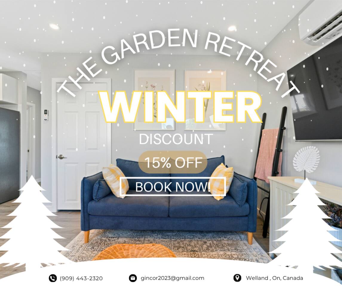 Welcome to our newly created one bed one bath Garden Retreat in Welland –the perfect getaway for couples or business travelers! This suite is fully licensed for short-term rentals (License No. STR-277) . Enjoy a comfortable stay with : ✔ Fully stocked kitchen ✔ High speed internet ✔ Smart TV ✔ Comfortable bedroom ✔ Work area ✔ Casual family room ✔ Luggage Storage Drop-off And much MUCH more! Centrally located and minutes away from all of the attractions that the region has to offer!